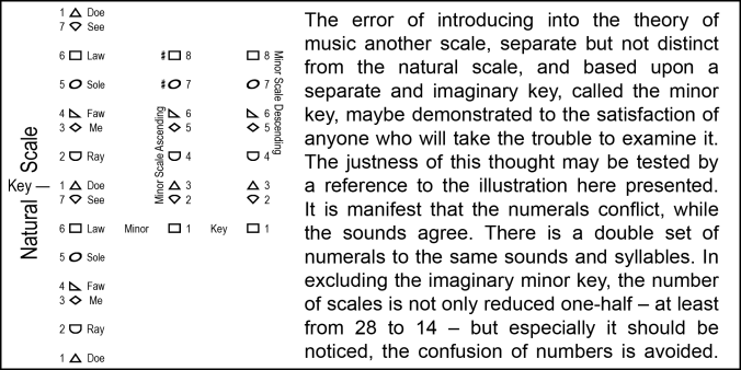 But when this is accomplished, and the situation of the half-intervals as always occurring between three and four, and between seven and eight, has become familiar to the pupil; and pleased with the ease with which he is able to recognize the high and low sounds by their numerical relation to the key, he fancies himself just prepared to read music with some satisfaction, his mind is at once and suddenly upset by the introduction of another scale, whose numerals conflict throughout with that which has been so firmly fixed in his mind. Now three is no longer three, but five; five is metamorphosed into seven; two has become four; four is six; seven is two; and one, yes, one, the key, which he supposed to be fixed, independent and immovable, sitting as a monarch on his throne, marshalling and locating his subjects around him, is now dethroned, and made to take the place of a slave. And to add to his confusion, he finds that even the “semitones” are represented as unfaithful servants to their master, now in duress, and as having in the general confusion left their places and taken their stations elsewhere. Inquiring earnestly for their whereabouts, he learns, to his amazement, and to the utter undoing of his confidence, that their location is uncertain; they have no abiding-place – that “in the minor scale, the tones and semitones do not occur in the same order, ascending, that they do in descending.”