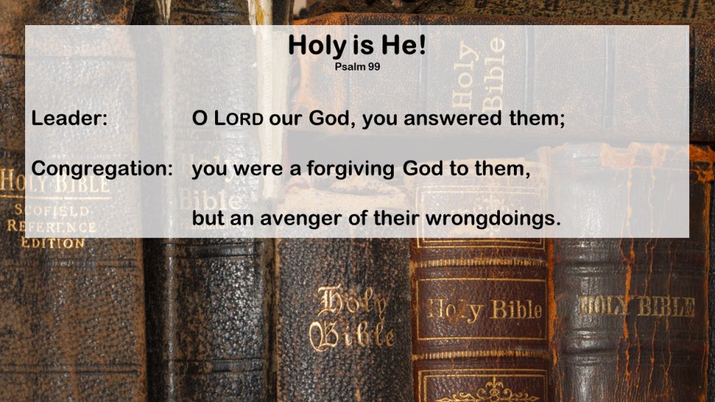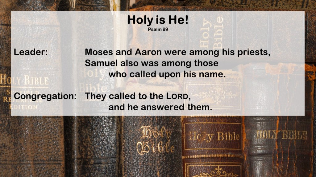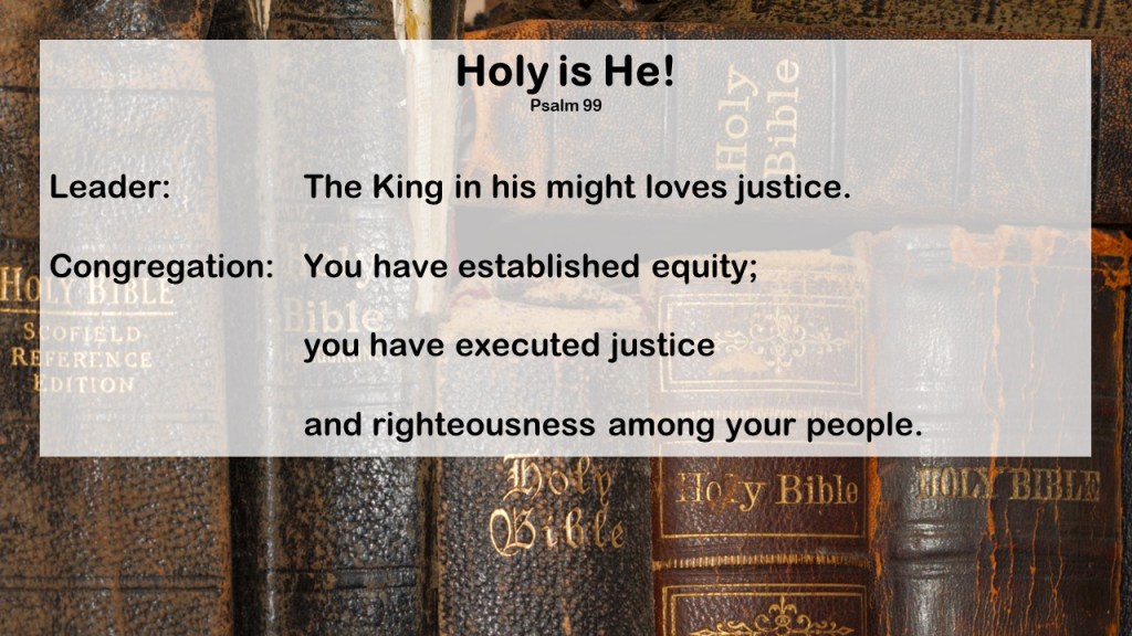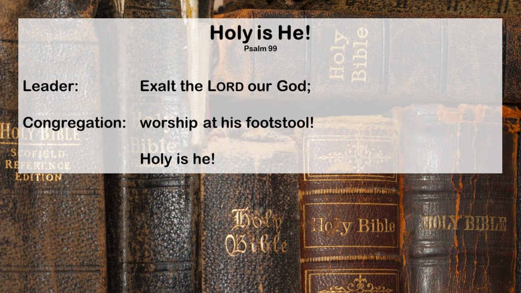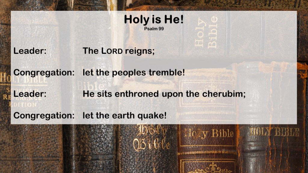 I never feel bound by the lectionary-assigned scripture readings, but I will usually consult the Revised Common Lectionary for a reading just to keep me from returning to the same passages each time. On this week, Psalm 99 was a very apropos passage and very adaptable to our back-and-forth format.